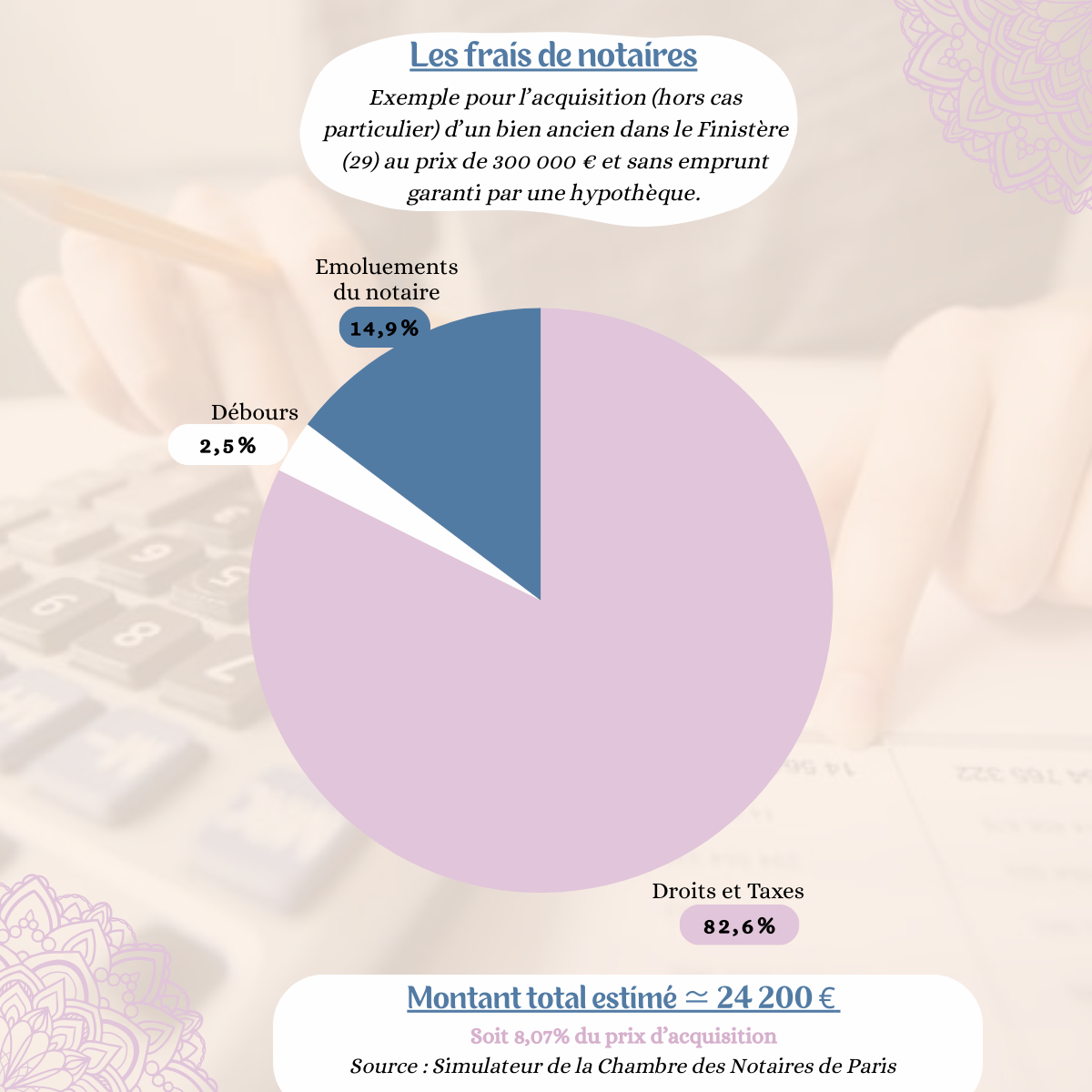 ➝ Les droits et taxes comprennent les taxes liées au transfert de propriété et enregistrement de la vente auprès du service de la publicité foncière. Cela représente la majorité de la facture !
